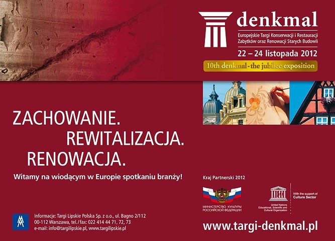 W dniach 22–24 listopada br. odbędzie się 10. jubileuszowa edycja najważniejszego spotkania branży ochrony zabytków oraz restauratorów i konserwatorów zabytków z całego świata – Europejskich Targach Konserwacji i Restauracji Zabytków oraz Renowacji Starych Budowli denkmal w Lipsku.
