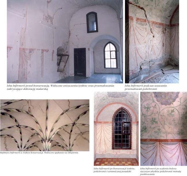Prace poprzedzone były badaniami konserwatorskimi, które poszerzyły wiedzę o historycznych nawarstwieniach, zwłaszcza dekoracji ścian. Z badań wynikało, ze zachowały się nieliczne fragmenty historycznych tynków z pobiałami w Sieni, Refektarzu, Izbie oraz Gdanisku. Dodatkowo w Izbie i Gdanisku występują na nich pozostałości, najprawdopodobniej renesansowych wymalowań. W podłuczu przy oknie Izby jest to ornament roślinny barwy zielonej z elementem kwiatowym w centralnym punkcie. Dekoracja była przemalowana i stała się elementem malarskiej aranżacji wnętrz wykonanej przez malarzy Steinbrechta. Śladowe pozostałości zielonej wici z czerwonym odwrociem liści zachowały się też na ścianie południowej Izby. Na sklepieniu i ościeżach otworu drzwiowego Gdaniska występuje słabo zachowana zielona wić z ugrowo - czerwonymi kwiatami.