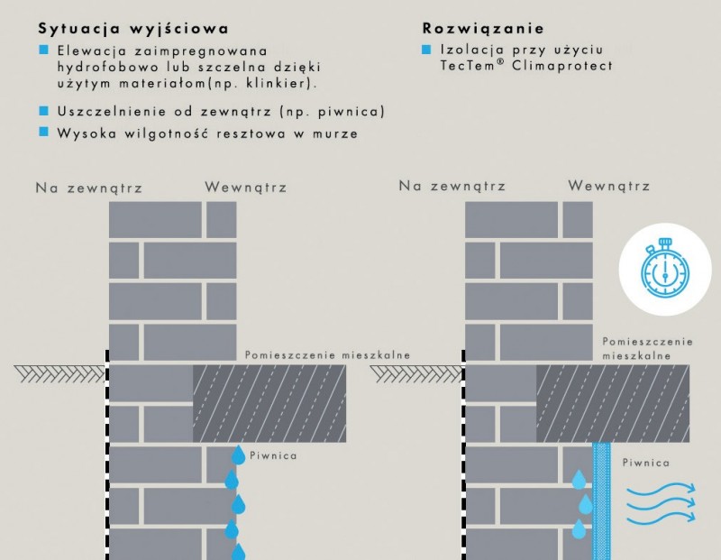 Ściany w budynkach nieustannie poddawane są ekspozycji na wilgoć z różnych kierunków. Na zewnątrz wilgoć dostaje się do budynku wraz z wodą gruntową (kapilarne podciąganie wilgoci), a także poprzez ulewne deszcze i wodę odpryskową z gruntu.