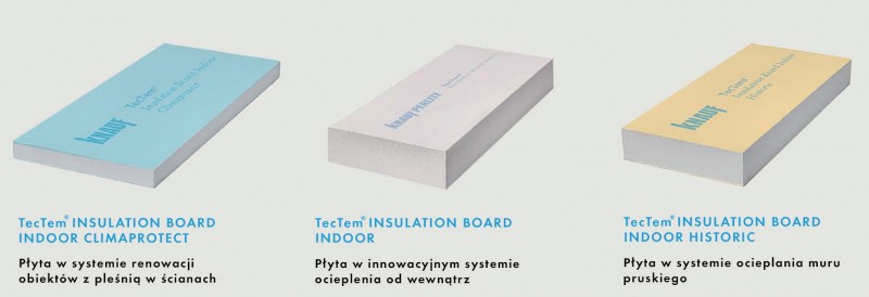 TecTem® Insulation Board Indoor Climaprotect – przeznaczona do wykorzystania w systemie renowacji obiektów, w których występuje problem pleśni w ścianach. TecTem® Insulaton Board Indoor – wykorzystywana w innowacyjnym systemie ocieplenia budynków od zewnątrz. TecTem® Insulation Board Indoor Historic – płyta przeznaczona do użycia w systemie dedykowanym do ocieplania zabytków z murem pruskim. Każdy projekt dotyczący ocieplenia zabytkowych budynków od zewnątrz wymaga zastosowania specjalistycznych rozwiązań, a sam etap projektowania powinien być poprzedzony wnikliwą analizą sytuacji wyjściowej budynku. Eksperci z firmy Knauf służą doradztwem i pomocą przy projektowaniu na każdym etapie wykonywania inwestycji.
