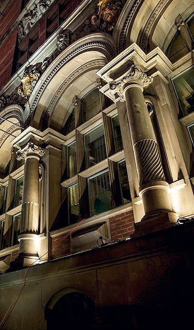 Biorąc pod uwagę te uwarunkowania, jako autorzy projektu (arch. Michał Kaczmarzyk, inż. Krzysztof Pająk) postanowiliśmy wprowadzić iluminację w formie ogólnej, zalewowej, ale realizowanej z opraw doziemnych, tak, aby uwypuklić detale podziałów poziomych elewacji. Dzięki takiemu rozwiązaniu wszystkie gzymsy i wypusty elewacji uzyskały delikatne świetlne podkreślenie dzięki różnicy luminancji na powierzchni elewacji – stycznej do osi strumienia światła opraw doziemnych, a płaszczyzną prostopadłą gzymsów pośrednich, głównego gzymsu czy parapetów. Całość uzupełniła iluminacja połaci dachowych, zrealizowana dzięki oprawom liniowym. Bez wątpienia ta techniczna część projektu, której celem było noc--ne zaprezentowanie obiektu jako jednorodnej bryły, tak, aby światło nie stanowiło nowej wartości modelującej formę architektoniczną, zamykała typowe myślenie o projekcie iluminacji.