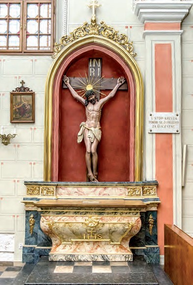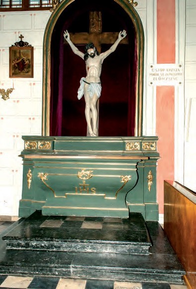 Prace konserwatorskie przy drewnianym wyposażeniu kościoła potwierdziły różnorodność aranżacji estetycznej poszczególnych elementów. Poczynając od jasnobłękitnego ołtarza głównego, poprzez kolorowe marmoryzacje ołtarzy bocznych, z których zachowane Matki Boskiej i św. Jana Chrzciciela mają wyraźne cechy wspólne. Ołtarz Pana Jezusa Ukrzyżowanego jest już kompilacją mensy ołtarzowej analogicznej jak w dwóch poprzednich ołtarzach, ale drewniane obramowanie wnęki (pierwotnie obramowanie stiukowe) powstało w wyniku wtórnej aranżacji i umieszczenia we wnęce krucyfiksu ofiarowanego zgromadzeniu przed 1875 r. z kaplicy przy kościele oo. Kapucynów w Krakowie. Figura Chrystusa była opisywana jako drewniana, jednak w trakcie prac okazało się, że jest to rzeźba gipsowa. Mensa może pochodzić z opisywanego w kronikach klasztornych, a nieistniejącego obecnie ołtarza Trzeciego Upadku pod Krzyżem.