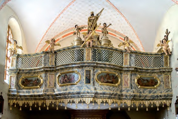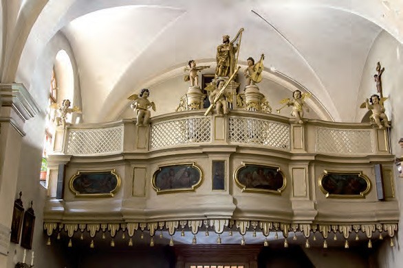 Chór muzyczny zajmuje całą szerokość kościoła w tylnym przęśle. Pod przemalowaniami znaleziono aranżację malarską w postaci marmoryzacji nawiązujących wprawdzie kolorystyką do ołtarzy bocznych, jednak o nieco innym rysunku i sposobie namalowania użyleń marmuru. W plątaninie szaroniebieskich smug i żyłek po wewnętrznej stronie parapetu chóru ukryta została data powstania tej malatury – A.D. 1733.