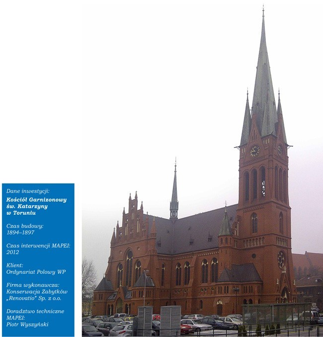Kościół według projektu niemieckiego wojskowy kościół katolicki. Budynek szczęśliarchitekta Schönhalsa wzniesiony został poza wie przetrwał obie wojny światowe, jednak po obrębem murów nowomiejskich, na placu św. drugiej wojnie, podczas której wykorzystywany Katarzyny, obecnie znajduje się w bezpośred-był jako zbór ewangelicki dla niemieckich żołnim sąsiedztwie toruńskiej Starówki. Najpierw nierzy, wymagał remontu zarówno wewnątrz, funkcjonował jako protestancki kościół woj-jak i na zewnątrz. Ołtarz główny, przedstawiaskowy, a w 1920 r. został konsekrowany jako jący figurę Chrystusa Zmartwychwstałego, oraz pozostałe rzeźby, którymi ozdobiono kościół, wykonane zostały przez rzeźbiarza Ignacego Zelka. W oknach prezbiterium znajdują się witraże z wizerunkami świętych, wykonane w 1897 r. w Toruniu. W kościele posłuchać można dźwięku 35-głosowych organów. W ostatnich latach przeprowadzono prace remontowo-konserwatorskie, w wyniku których odnowiona została południowa elewacja, wieża, cztery tarcze zegarowe oraz dach świątyni.