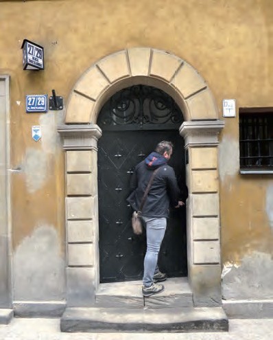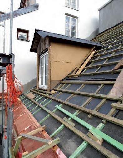 Na Krakowskim Przedmieściu zostawiliśmy auto i z wykonawcą dachu, certyfikowanym dekarzem Braas Grzegorzem Czyżem poszliśmy raźnym krokiem w stronę ulicy Świętojańskiej. Po kilku minutach ukazał się widok podwieszonych pod okapem rusztowań. Po chwili staliśmy pod bramą kamienicy przy Świętojańskiej 27/29. Klamka skrzypnęła i zniknęliśmy w zakamarkach podwórka kamienic spod numerów 27, 29 i 31.