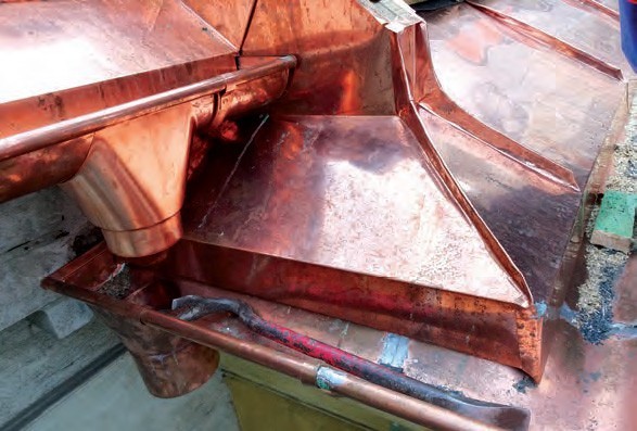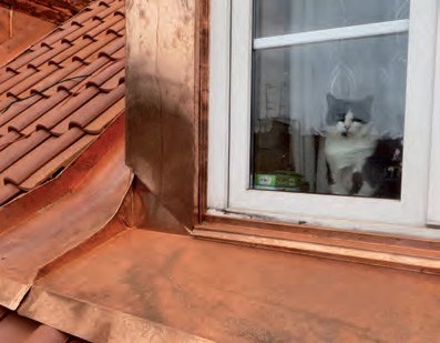 Na górze zaczęliśmy od oglądania obrobionych miedzią lukarn. Pan Grzegorz pokazał, w jaki sposób wykonał okap i odwodnienie dachu. Dłuższą chwilę rozmawialiśmy również o metodzie wentylowania nie tylko dachówki, ale też szczeliny między deskowaniem a ociepleniem międzykrokwiowym. Prawidłowa wentylacja pokrycia dachowego przyczynia się do długowieczności dachówek, a wentylacja warstw wewnętrznych przegrody dachowej do większej żywotności całej konstrukcji dachu. Ciekawym rozwiązaniem, zastosowanym przez wykonawcę robót, jest wykonanie dodatkowych szczelin wlotowych pod papę i deskowanie w 1/3 i 2/3 długości krokwi. Polega to na bezpiecznym rozszczelnieniu warstwy wstępnego krycia i zabezpieczeniu tej szczeliny metalową siatką. Ujście wentylacji znajdowało się w samej kalenicy, ale o tym za chwilę. Tutaj, na rusztowaniu przy okapie, miałem nieodparte wrażenie, że ktoś mi się przygląda. Odruchowo odnalazłem wbity we mnie wzrok. Właściciel tej pary znudzonych oczu i szpiczastych uszu, jak się okazało, był już dobrze zaprzyjaźniony z całą ekipą. Weszliśmy na dach.
