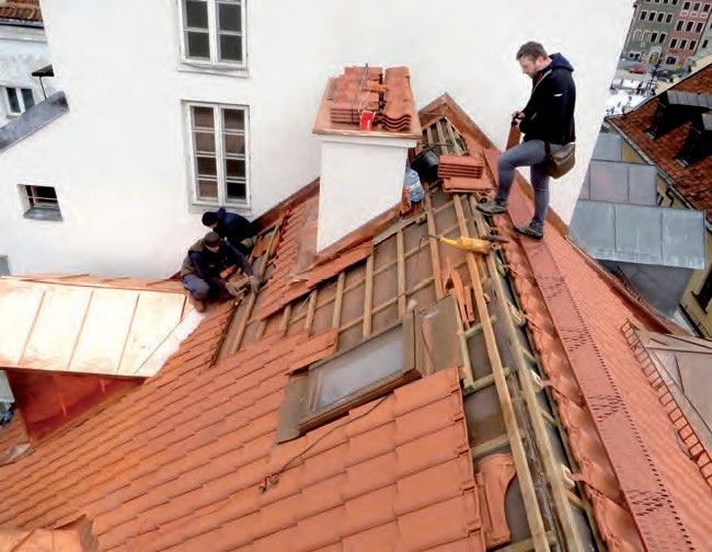 Na dole, przy pokaźnej zaginarce, długo dyskutowaliśmy na temat sposobu wykonywania pewnych obróbek blacharskich. To była kontynuacja rozmowy zainicjowanej na jednym ze szkoleń Braas, w którym pan Grzegorz Czyż brał udział. Pod rusztowaniem magazynowana była ceramiczna dachówka esówka. Braas produkuje wiele różnych modeli dachówek ceramicznych, a ten konkretny model, zastosowany na dachach przy Świętojańskiej, nazywa się Achat 12V. Teraz czekała nas mała wspinaczka po drabinkach rusztowania – poszło szybko.