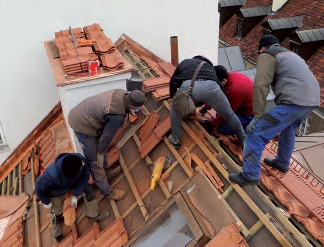 Dekarzy zastaliśmy przy układaniu dachówek w koszach i wykonywaniu obróbek kominków wentylacyjnych. W końcu znaleźliśmy się na kalenicy. Pan Grzegorz Czyż potwierdza swoją pracą i stosowanymi materiałami, że remonty chce wykonywać dobrze z dobrych i trwałych materiałów. Do dachówki Achat 12V zamówił w Braasie specjalne ceramiczne dachówki kalenicowe-wentylacyjne, a jest to wyjątkowe rozwiązanie, tworzące, w połączeniu z gąsiorami, labiryntowy system wentylacyjno-uszczelniający. W tym miejscu uchodzi wentylacja spod pokrycia dachowego. Wlot do wentylacji zrealizowany został oczywiście w okapie, a ruch powietrza pod dachówką odbywa się wzdłuż kontrłat ku górze. Powstał jeszcze problem techniczny – wypuszczenia powietrza wentylującego przestrzeń między deskami a ociepleniem. Wprowadzono je w tę przestrzeń wspomnianymi wcześniej rozszczelnieniami w połaci dachu. Jak to zrobił pan Czyż? Otóż zastosował tak zwaną kalenicę otwartą, ale szczelną. Rozciął warstwę wstępnego krycia (tutaj papę), aby umożliwić wylot powietrza spod desek, a w samej kalenicy nałożył na kontrłaty (pod gąsiorami) pas membrany, która ma dodatkowo zapobiegać ewentualnemu nawianiu śniegu czy deszczu w to nacięcie przy jakiejś awarii gąsiorów w przyszłości. A potem… weszliśmy na najwyższy komin.