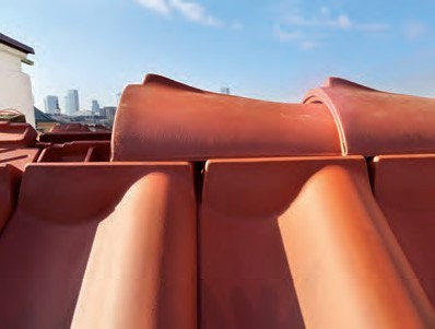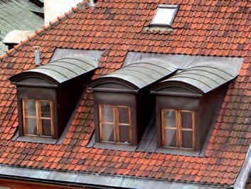 Tutaj z bliska przyjrzałem się szczelinom wentylacyjnym w połaci. Wykonawca wyjaśnił, jak wyglądała naprawa lukarn i jak wykańczał ogniomury między poszczególnymi kamienicami. Teraz była sposobność, aby dokładniej obejrzeć obróbki blacharskie przy dachówkach. Achat 12V, jako ceramiczna dachówka esówka, przepięknie wkomponowała się w ten konkretny dach i w charakter otoczenia. Achat 12V ma bardzo dużą tolerancję nasuwania jednej dachówki na drugą, więc dekarze nie mieli kłopotu z rozmierzeniem dachu od okapu do kalenicy. Pan Grzegorz Czyż zwrócił uwagę na fakt, że ta cecha dachówki Achat 12V, czyli duża tolerancja nasuwania wynosząca 30 mm, doskonale sprawdza się także na dachach nietrzymających idealnej geometrii. Powoli posuwaliśmy się ku kalenicy.