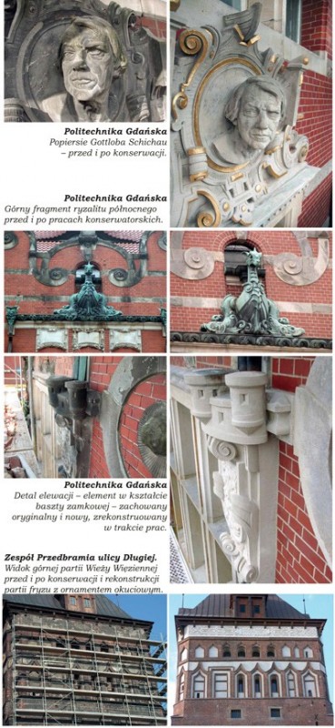 Z podobną problematyką przyszło nam się zmierzyć po kilku latach, tym razem na elewacjach Politechniki Gdańskiej, w dwóch etapach prac. Pierwszy (2007) dotyczył konserwacji ryzalitu w osi głównej północno-za chodniego skrzydła gmachu głównego, drugi (2008) trójdzielnego ryzalitu frontowego, usytuowanego w osi głównej skrzydła wschodniego. Czas powstania zabytku, konstrukcja i materiał, forma architektoniczna, bogata, symboliczna dekoracja oraz dalsze losy są bardzo bliskie budynkowi banku.