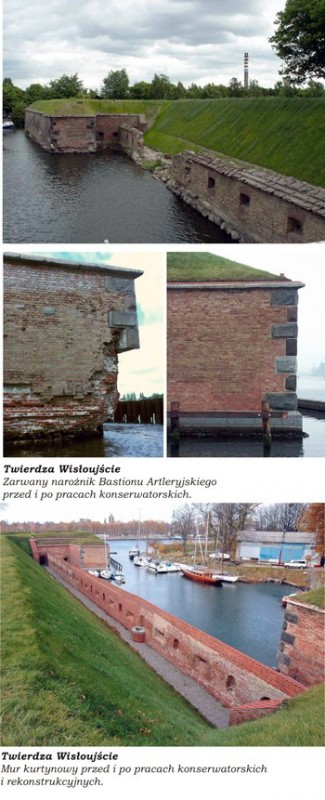 Kolejnym wyzwaniem był remont budowli o charakterze militarnym – Bastionu Artyleryjskiego (2004–2006) oraz Murów Kurtynowych i Fosbrei (2009–2010) Fortu Carré Twierdzy Wisłoujście. Projekt konserwacji Bastionu Artyleryjskiego Fortu Carré miał charakter kompleksowy. Zadanie obejmowało wykonanie badań architektonicznych i konserwatorskich, opracowanie wytycznych konserwatorskich i programu prac wraz z projektem rekonstrukcji cokołu oraz wykonanie na podstawie powyższych opracowań prac budowlano-konserwatorskich. W realizację prac hydrotechnicznych, izolacyjnych i ziemnych włączeni byli inni wykonawcy, działający na bezpośrednie zlecenie Inwestora.