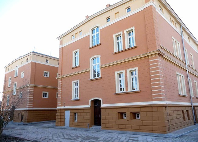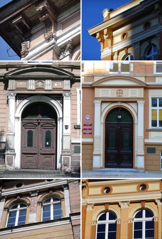 Opaski okienne wykonano również z szybkowiążącej zaprawy sztukatorskiej Stukoplan. Wykonywano je jednak na stołach, a następnie, po związaniu zaprawy sztukatorskiej, docinano na wymagane długości i montowano wokół otworów okiennych. Niektóre z detali o skomplikowanych kształtach odtworzono poprzez odlewanie w formach silikonowych. Używano do tego celu gipsu sztukatorskiego. Po zakończeniu prac tynkarskich oraz sztukatorskich cała powierzchnia elewacji została przeszpachlowana przy użyciu Zaprawy szpachlowej SHF o u ziarnieniu 0 -0,6 mm. Zafilcowanie nałożonej szpachli pozwoliło na ujednolicenie faktury na całej powierzchni elewacji. Szpachla SHF zawiera włókno rozproszone, i tym samym zwiększa odporność wierzchniej warstwy na ewentualne włosowate spękania podłoża.