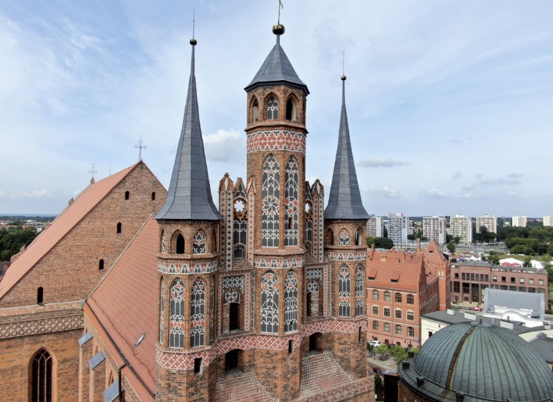Prace restauratorskie maswerkowej dekoracji blend i fryzów szczytu wschodniego kościoła pw. Wniebowzięcia Najświętszej Marii Panny w Toruniu przeprowadzono w 2021 roku. Zostały one zaplanowane już w roku 2019, kiedy podczas prac konserwatorskich elewacji prezbiterium kościoła1 na tynkach szczytu znaleziono relikty rytów i warstwy barwnej potwierdzające istnienie tu maswerków. Wcześniej o ich obecności pisali historycy sztuki i badacze średniowiecznej architektury2, jednak w powszechnej świadomości jedyną dekoracją szczytu były jasne tynki kontrastujące z ceglanym licem muru.