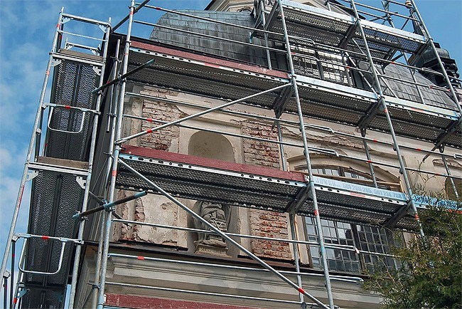 Fronton bazyliki ozdabiają okazałe kolumny, które ze względu na spękania także wymagały gruntownej renowacji. W tym celu w zaprawę naprawczą PLANIGROUT HDM RESTAURO wklejono siatkę MAPEGRID G220 z alkaloodpornych włókien szklanych, stosowaną do wzmacniania konstrukcji murowych. Następnie powierzchnię przeszpachlowano drobnoziarnistą zaprawą MAPE-ANTIQUE FC CIVILE, służącą do wyrównywania powierzchni tynków renowacyjnych. Tu także jako warstwę wykończeniową zastosowano farbę wapienną i laserunki. Ostatnim etapem było odnowienie krużganków. W tej części obiektu zastosowanie znalazła bezcementowa zaprawa MAPE-ANTIQUE STRUTTURALE NHL. Jest to zaprawa o wysokich parametrach, na bazie hydraulicznego wapna i ekologicznej pucolany, zalecana szczególnie jako warstwa tynku lub warstwa wzmacniająca konstrukcje murowane z kamienia lub cegieł.
