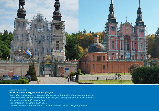 Zaplanowane na terenie sanktuarium maryjnego w Świętej Lipce prace renowacyjne obejmowały m.in. zdjęcie starych wypraw tynkarskich i nałożenie tynków renowacyjnych, a w wybranych miejscach wzmocnienie konstrukcji muru. Nim do ich realizacji przystąpiło MAPEI, podjęto nieudane próby z użyciem materiałów innych producentów, co spowodowało spękanie wypraw tynkarskich. Doradcy MAPEI zaproponowali zastosowanie systemu tynków renowacyjnych MAPE-ANTIQUE. Jest to grupa produktów bezcementowych, wykorzystujących jako spoiwo ekologiczną pucolanę – wysoce reaktywną i o jasnej barwie, tworząc dobry podkład pod wymalowania. Dzięki specyficznemu rodzajowi pucolany zaprawy MAPE-ANTIQUE mają wysoką porowatość, a zaprawa w ciągu kilku dni uzyskuje strukturę morfologiczną tożsamą z zaprawami historycznymi. Makroporowata struktura tynków MAPE-ANTIQUE zapewnia także szybkie odparowywanie wilgoci zawartej w starym murze.