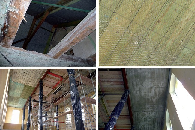 Po zapoznaniu się ze stanem technicznym obiektu zaproponowaliśmy następujące rozwiązanie. Sprawdzenie stanu technicznegostarych desek, przymocowanych do konstrukcji stropu. Deski uszkodzone przez owady niszczące drewno, jak również zagrzybione, zostały usunięte. Cała drewniana konstrukcja więźby dachowej, stropu nad nawą główną oraz deski poszycia zostały nasączone preparatem grzybobójczym oraz zwiększającym odporność drewna na działanie ognia. Ubytki w poszyciu stropu uzupełniono nowymi, wysuszonymi deskami. W celu uniknięcia pękania tynków na skutek odkształceń poprzecznych drewna stosowano deski o szerokości maksymalnej 12 cm. Deski o większych szerokościach były rozłupywane na placu budowy. Do tynkowania przystąpiono po ok. 4 miesiącach od pokrycia konstrukcji stropu deskami.