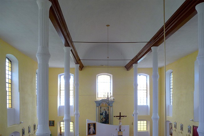Prace tynkarskie rozpoczęto od zamontowania do drewnianego sufitu prętów stalowych o średnicy 4 mm. Do naprężonych i starannie zamocowanych prętów przymocowano ocynkowaną siatkę tynkarską. Siatka była układana na zakład, przywiązywana do prętów za pomocą drutu wiązałkowego oraz dodatkowo mocowana przy użyciu wkrętów do drewna. Po starannym zamocowaniu i usztywnieniu siatki obrzucono ją Obrzutką cementową MZ 4. Obrzutka usztywniła osiatkowane podłoże oraz utworzyła szorstką powierzchnię, niezbędną do zakotwienia tynku. Następnego dnia przystąpiono do wykonania tynku podkładowego, który został wykonany z Lekkiej zaprawy tynkarskiej MK5-L. Zaprawa MK5-L jest zaprawą lekką, produkowaną na bazie perlitu. W przypadku tynkowania sufitów drewnianych jest to zaleta, umożliwiająca dociążenie sufitu stosunkowo niewielkim ciężarem. Pierwsza, podkładowa warstwa zaprawy tynkarskiej miała grubość ok. 15 mm i została zatarta na ostro. Po ok. 7 dniach wykonawca ułożył wierzchnią warstwę tynku – również z zaprawy MK5-L. Warstwa wierzchnia miała grubość 10 mm i została zatarta na gładko. W celu zmniejszenia prawdopodobieństwa pojawienia się rys i spękań na powierzchni tynku cały sufit został dodatkowo przeszpachlowany Zaprawą do szpachlowania SHF. Zaprawa SHF jest zbrojona włóknem rozproszonym, zwiększa odporność tynku na powstawanie rys związanych z odkształceniami drewnianego podłoża. Zaprawa szpachlowa została zatarta przy użyciu wilgotnej gąbki i stanowi idealne podłoże dla powłok malarskich. Po około 28 dniach od zakończenia prac tynkarskich sufity zostały zagruntowane Silikatowym preparatem gruntującym MTG, a następnie pomalowane dyfuzyjną Wewnętrzną farbą silikatową LI 400. Paroprzepuszczalna farba wewnątrz kościoła eliminuje niekorzystne zjawisko kondensacji pary wodnej na powierzchni sufitu. Przyjęta technologia remontu drewnianego stropu pozwoli na wieloletnią, bezawaryjną eksploatację obiektu zgodnie z jego przeznaczeniem.