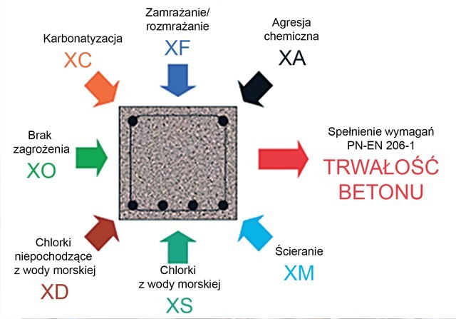 Przy czym wpływ oddziaływania środowiska, w którym pracuje dana budowla ma tutaj kluczowe znaczenie. Norma PN-EN 206-1 klasyfikuje środowiska ze względu na występujące zagrożenia wobec betonu: